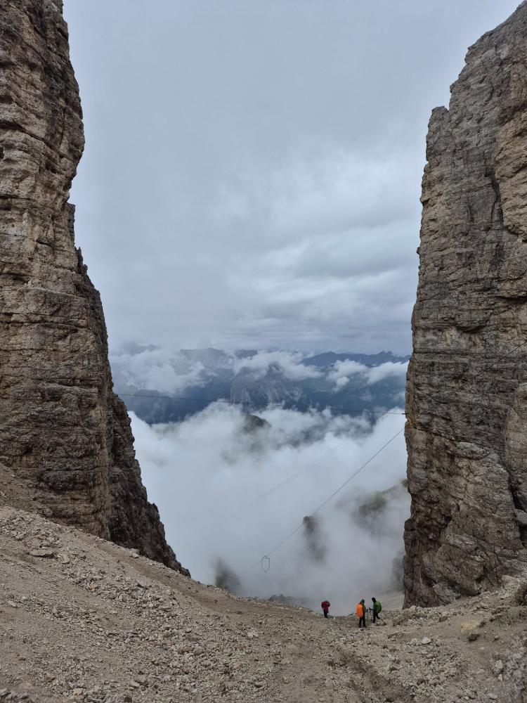 Te smo nastavili pješice stazom koja vodi kroz stjenovit tren, blatnjavom stazom s dosta serpentina i sipara. Vrime nam nije išlo na ruku, lagana kiša nas je pratila cijelim putem ,ali raspoloženje je bilo na visini. Kratku pauzu i okrjepu napravili smo u domu Rifugio Forcela Pordoi, koji je došao kao naručen u tom trenu.Dalje smo nastavili stazom koja je je bila nešto strmija s nekoliko dionica osiguranim sajlama. Sajle nisu bile puno tehnički zahtjevne ali je trebao dodatan oprez, jer su stijene bile skliske zbog kiše.
